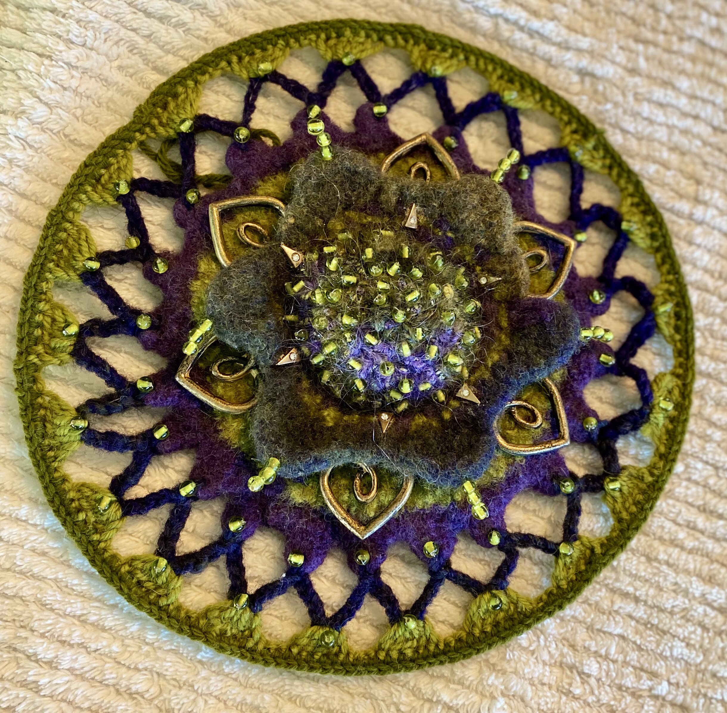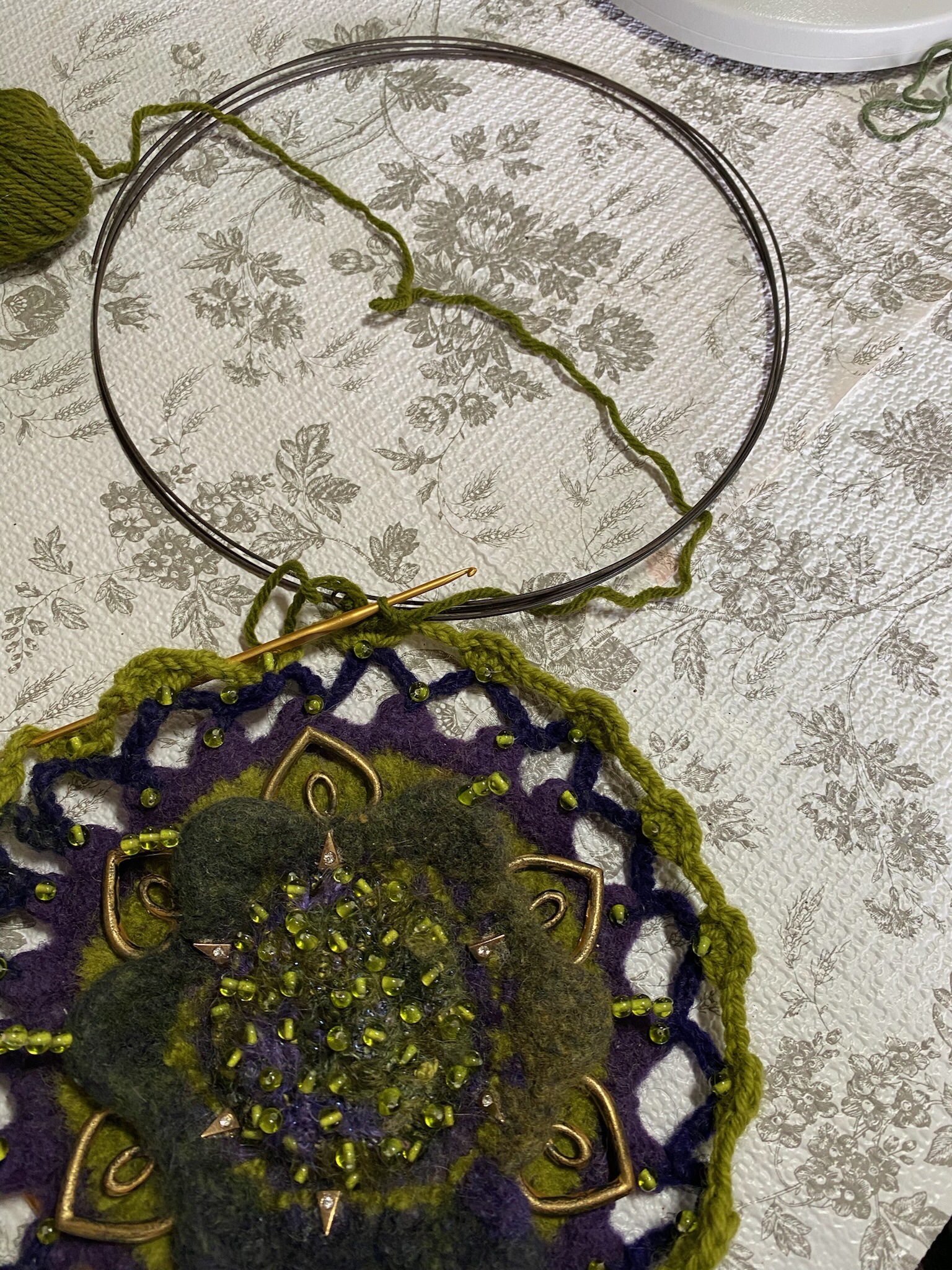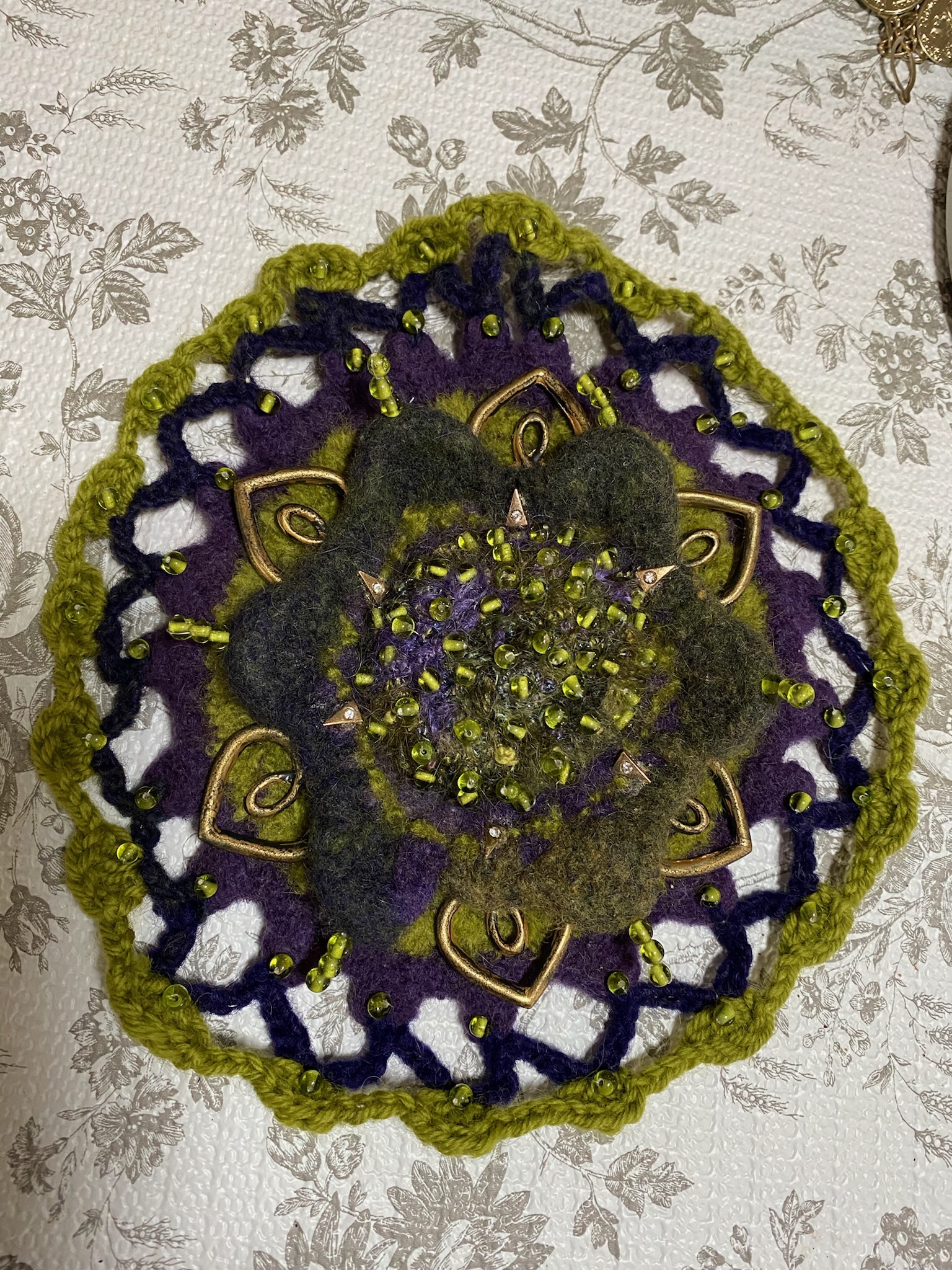 I am very pleased with how this one turned out. This crochet-felted wall hanging. Embellishments are; metal hearts turned fancy leaves., Green beads and gold studs.