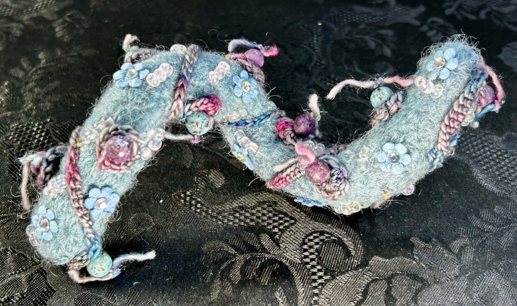 Going to the softer side of these. Soft delft blue with lavender and opalescent beading. Blue paper flowers with opalescent centers add a little glitz. These can be posed in different poses but… are not toys because of the delicate embellishments used.