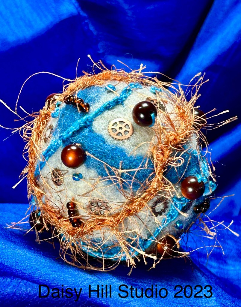 This Ivory/blue orb is crochet then felted in my 1950’s Speed Queen washing machine.
