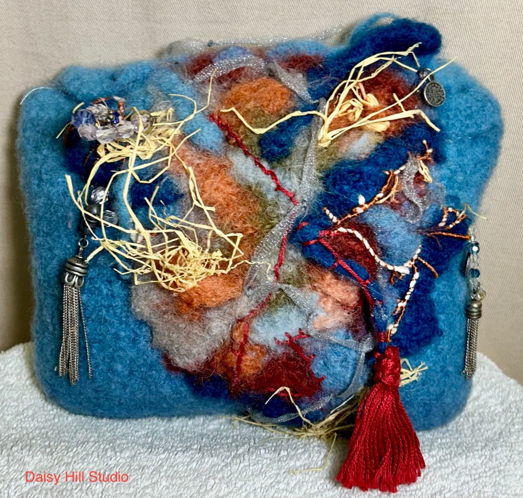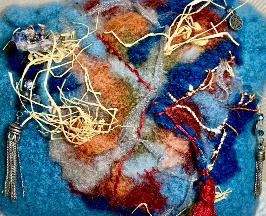 This is a small art bag done in dusty blue wool, rust, teal orange, and raffia. Silver tassels, organza ribbon travels throughout.