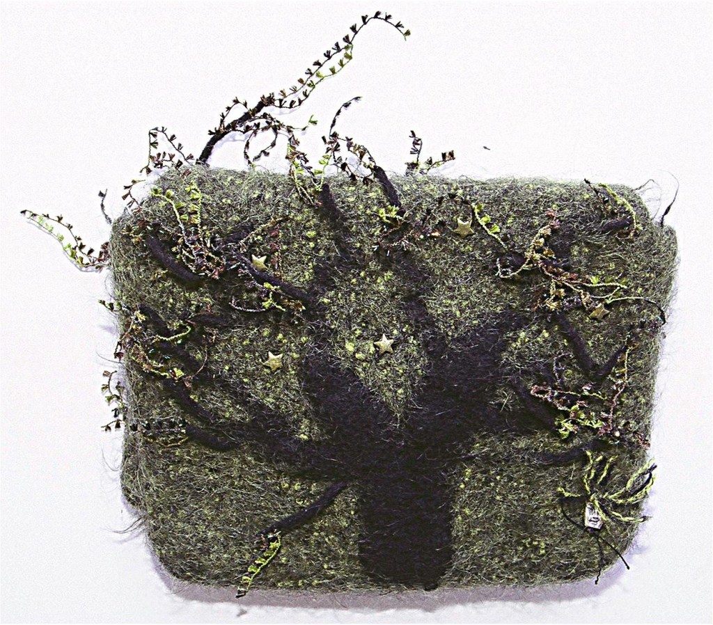 This was crocheted in wool and then felted in my 1950’ Speed Queen washing machine.