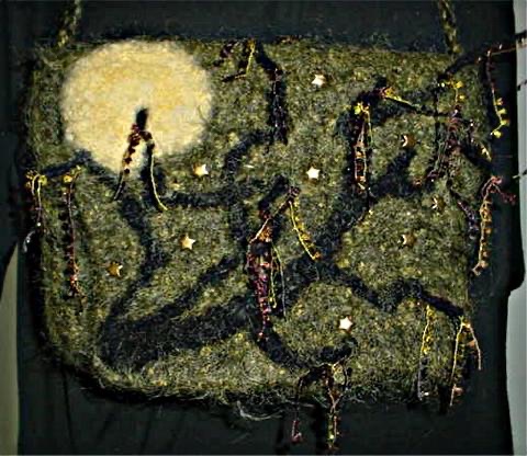 It is embellished in ladder like yarns (the hanging moss in trees). Gold stars are scattered through the front and back.
