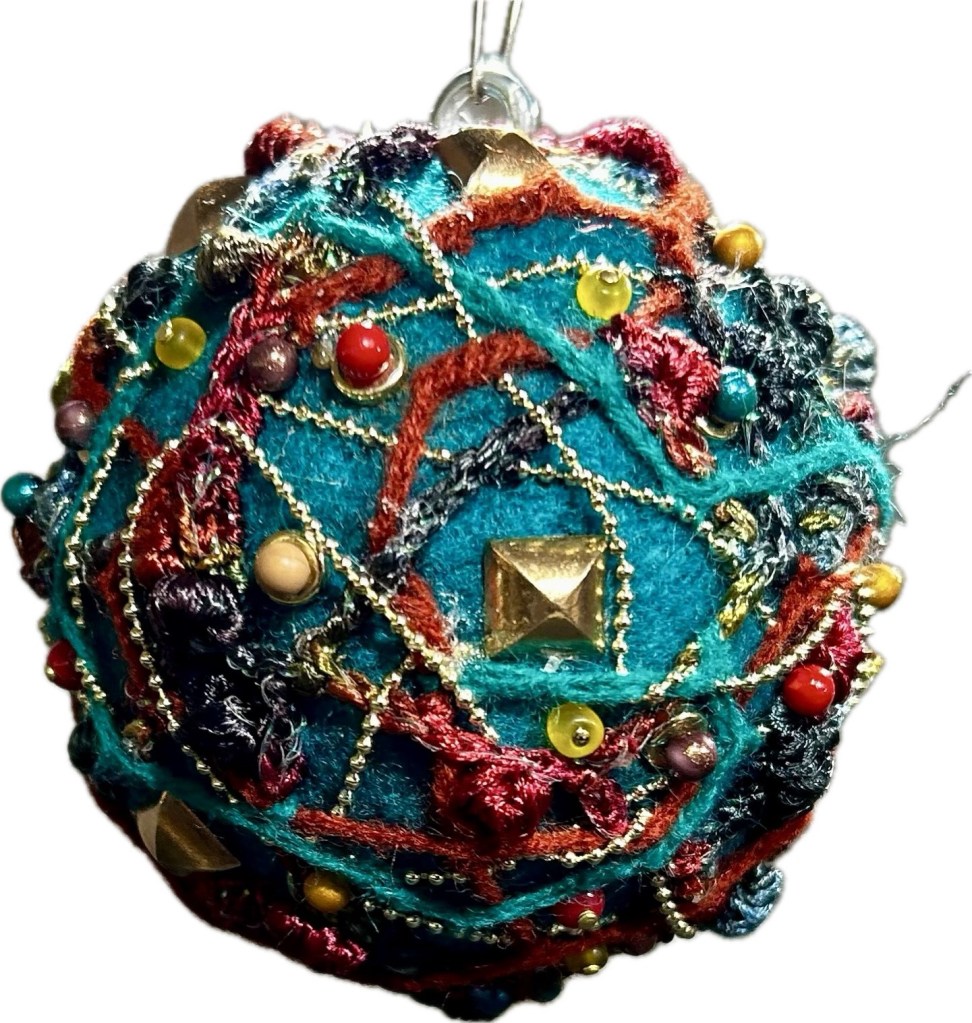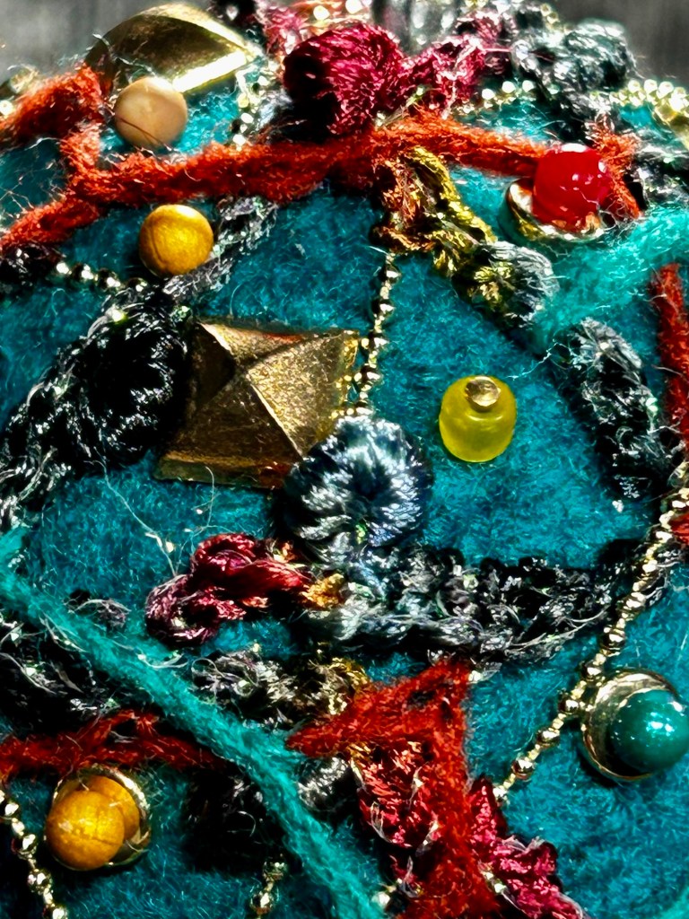 This dark teal orb is crochet then felted in my 1950’s Speed Queen washing machine.