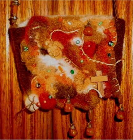 This is a smaller art bag done in brown wool yarn gradation on the back to ivory. From flap is shades of rusts, creams, camels and browns. Wooden cross and simple beading and stitching finishes off the piece.
