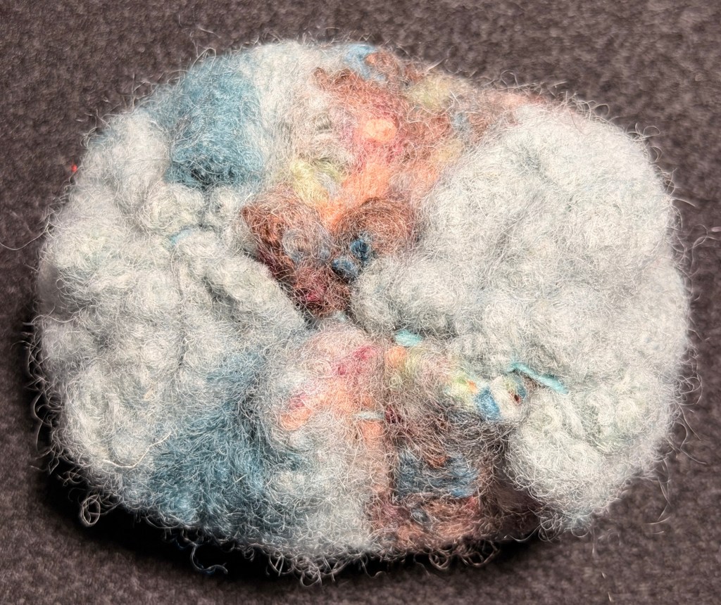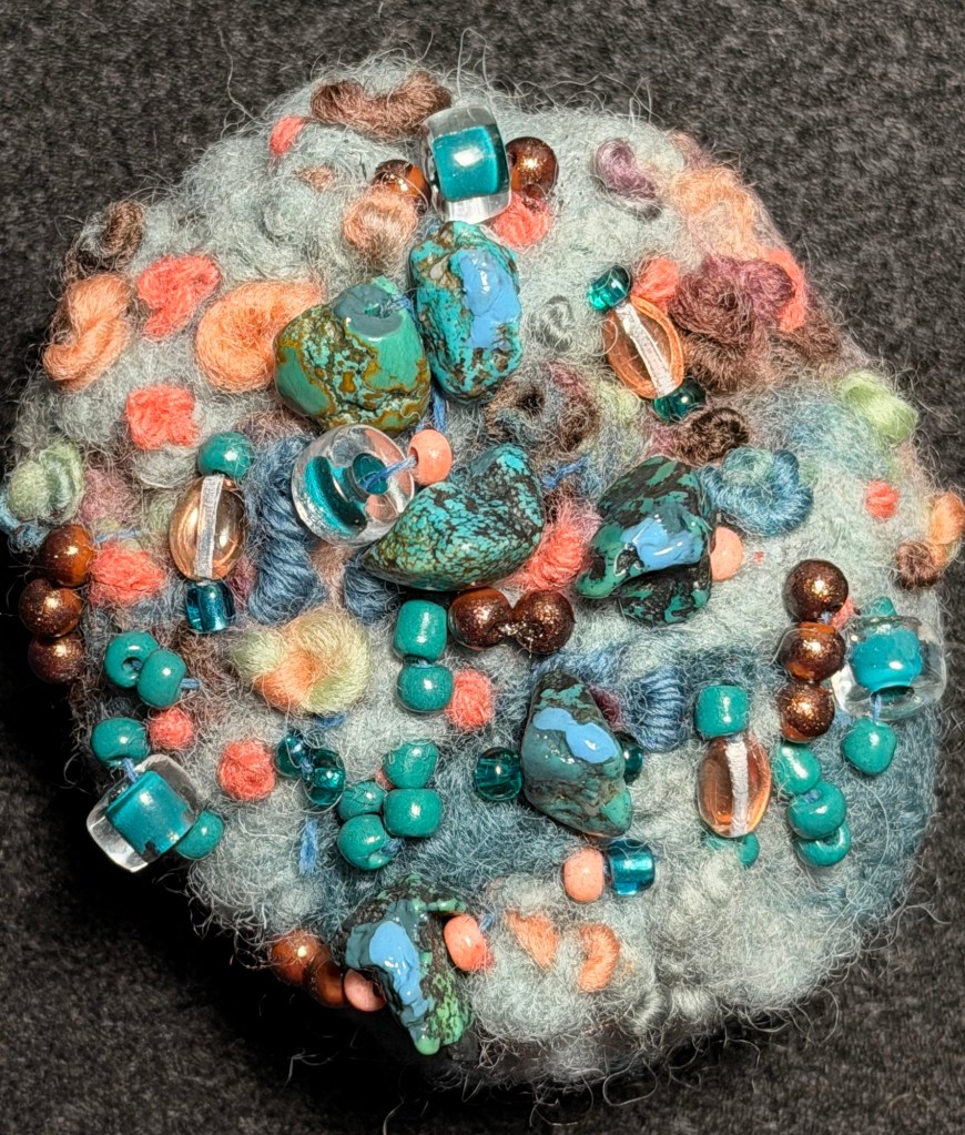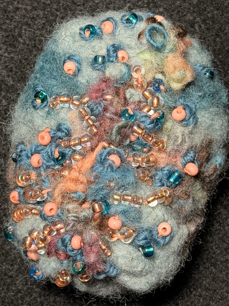 Fiber soft sculpture stones made from the same cloth but embellished in different ways.