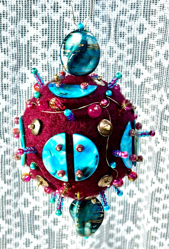 This dark burgundy orb is crochet then felted in my 1950’s Speed Queen washing machine.