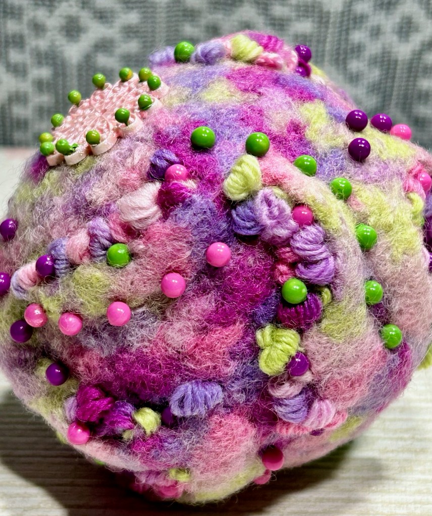 This pink/cream/lime green orb is crochet then felted in my 1950’s Speed Queen washing machine.