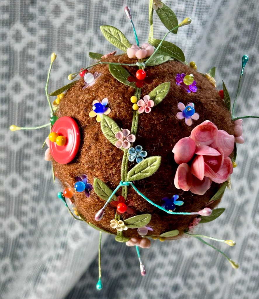 This brown orb is crochet then felted in my 1950’s Speed Queen washing machine.