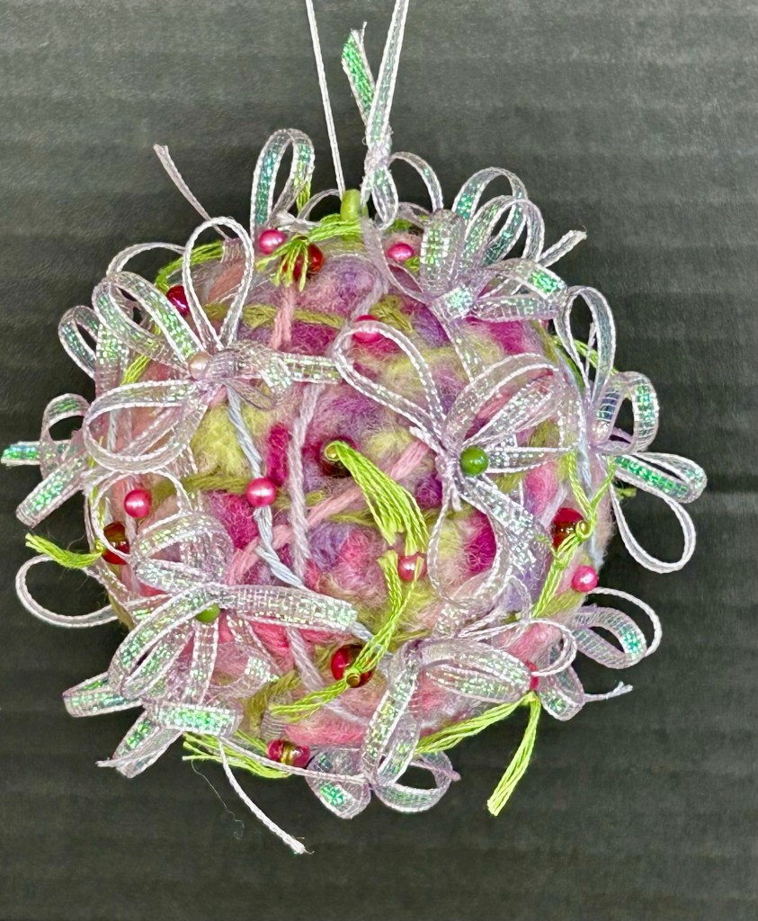 This soft pink orb is crochet then felted in my 1950’s Speed Queen washing machine.