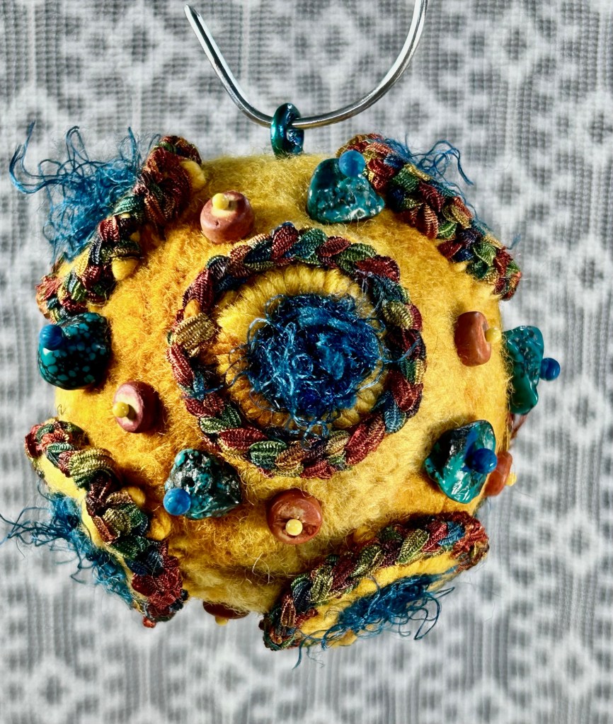 This yellow orb is crochet then felted in my 1950’s Speed Queen washing machine.