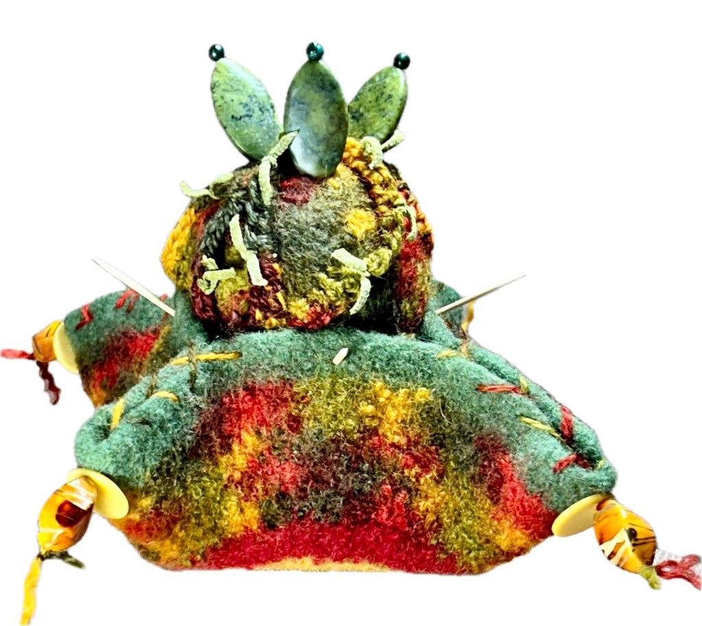 Which came first bowl or orb? Stone beads for a cactus and an interesting usage of the same yarns not felted. Different beads dangle from the bowl. Toothpicks hold the avocado on the bowl.