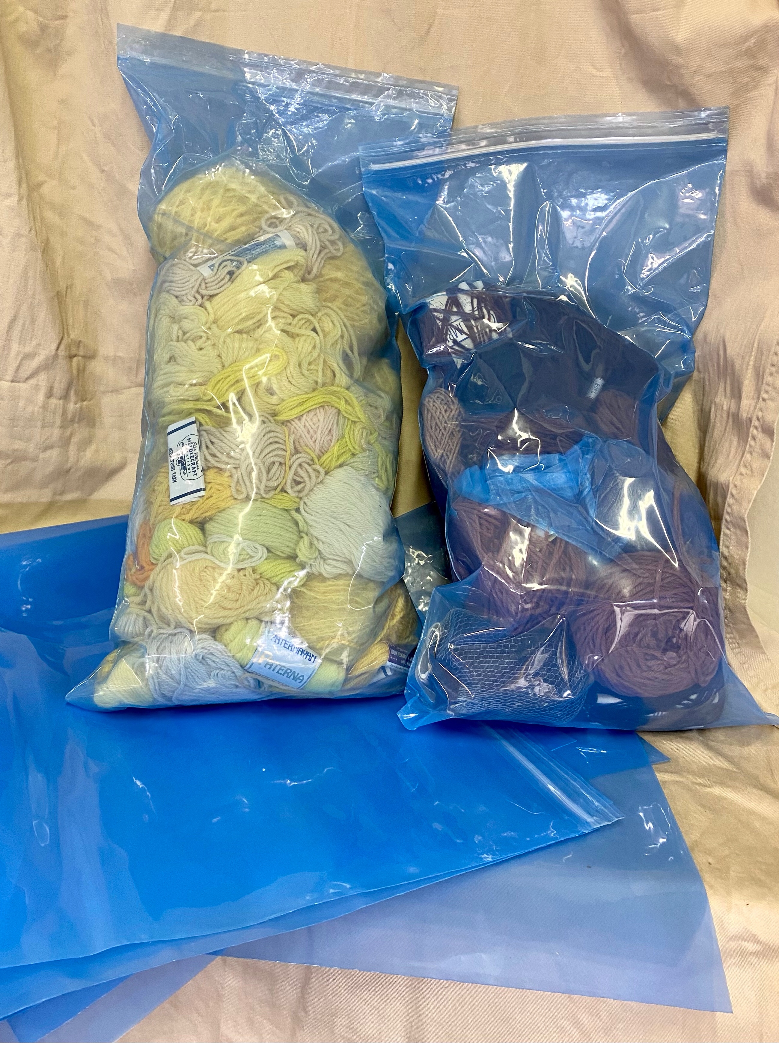 I found these bags at our local Restore. They are zip topped and I think the blue shade will keep yarn from fading. The size is 25” X 13”